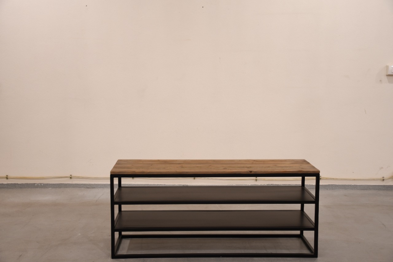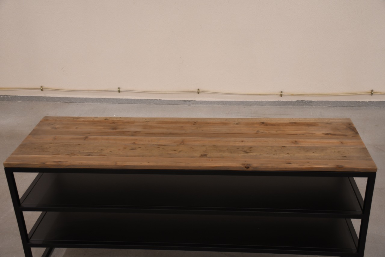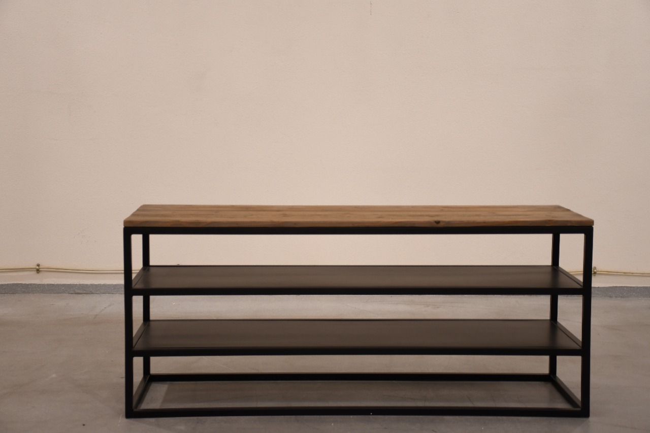 ELM WOOD TV TABLE WITH IRON SHELVES