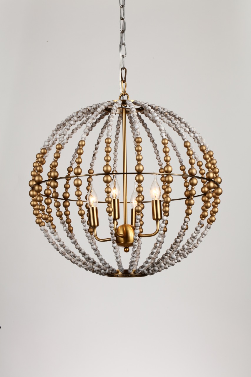 METAL AND WOOD BEADS PENDANT LAMP , IRON IN BRASS FINISHED , GREY AND GOLD WOOD