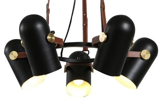 PENDANT LAMP WITH ROTATING METAL SHADE IN BLACK COLOR AND BROWN LEATHER HANGER